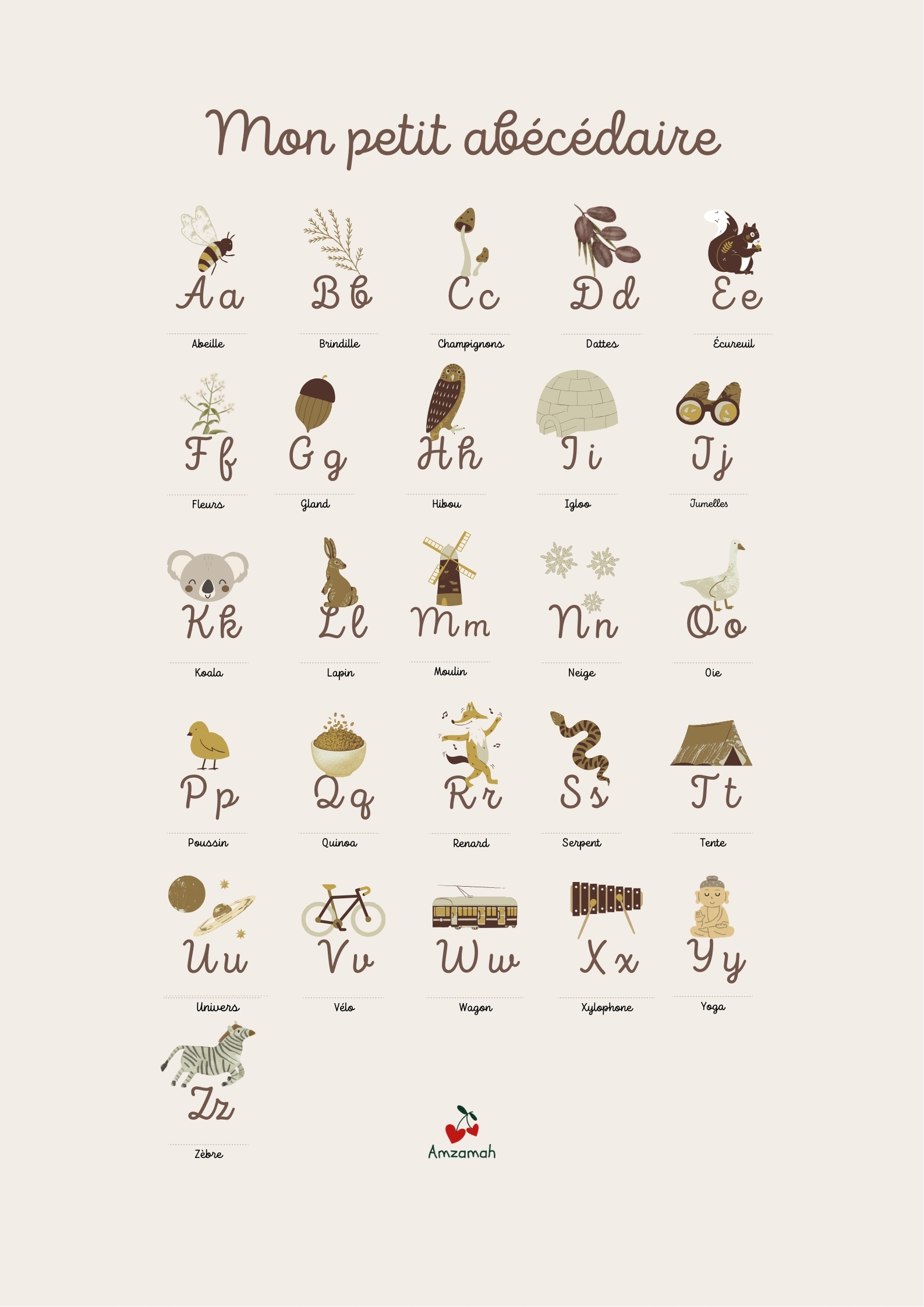 Une affiche douce pour découvrir les lettres de l’alphabet. Chaque lettre est joliment illustrée pour éveiller la curiosité et accompagner l’enfant dans ses premiers apprentissages. Parfaite pour décorer une chambre avec une touche éducative et tendre.
